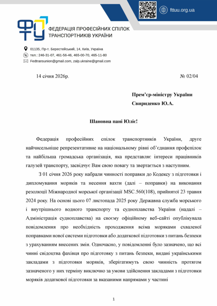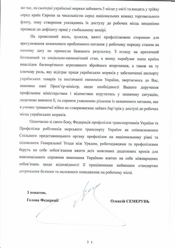 На превеликий жаль, зусилля, вжиті профспілковою стороною для врегулювання зазначеного проблемного питання у робочому порядку станом на поточну дату не принесли бажаного результату. З огляду на критичний безпековий та соціально-економічний стан, в якому перебуває наша країна внаслідок багаторічного агресивного збройного вторгнення, а також на ту ключову роль, яку відіграє праця українських моряків у забезпеченні експорту українських товарів та постачанні економіки України, звертаємось до Вас, шановна пані Прем’єр-міністр, щодо необхідності Вашого доручення профільним міністерствам і відомствам втрутитись у зазначену ситуацію, додатково вивчити її, та сприяти ухваленню рішення із зазначеного питання, яке в умовах триваючої війни не створюватиме зайвих бар’єрів у доступі до робочих місць українських моряків.