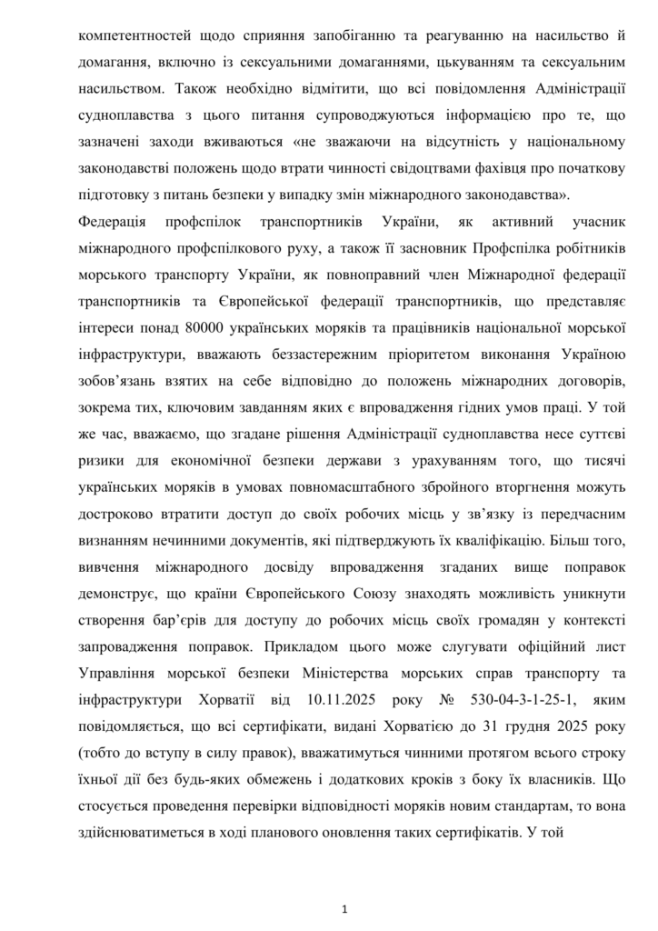 Федерація профспілок транспортників України, як активний учасник міжнародного профспілкового руху, а також її засновник Профспілка робітників морського транспорту України, як повноправний член Міжнародної федерації транспортників та Європейської федерації транспортників, що представляє інтереси понад 80000 українських моряків та працівників національної морської інфраструктури, вважають беззастережним пріоритетом виконання Україною зобов’язань взятих на себе відповідно до положень міжнародних договорів, зокрема тих, ключовим завданням яких є впровадження гідних умов праці. У той же час, вважаємо, що згадане рішення Адміністрації судноплавства несе суттєві ризики для економічної безпеки держави з урахуванням того, що тисячі українських моряків в умовах повномасштабного збройного вторгнення можуть достроково втратити доступ до своїх робочих місць у зв’язку із передчасним визнанням нечинними документів, які підтверджують їх кваліфікацію. Більш того, вивчення міжнародного досвіду впровадження згаданих вище поправок демонструє, що країни Європейського Союзу знаходять можливість уникнути створення бар’єрів для доступу до робочих місць своїх громадян у контексті запровадження поправок. Прикладом цього може слугувати офіційний лист Управління морської безпеки Міністерства морських справ транспорту та інфраструктури Хорватії від 10.11.2025 року № 530-04-3-1-25-1, яким повідомляється, що всі сертифікати, видані Хорватією до 31 грудня 2025 року (тобто до вступу в силу правок), вважатимуться чинними протягом всього строку їхньої дії без будь-яких обмежень і додаткових кроків з боку їх власників. Що стосується проведення перевірки відповідності моряків новим стандартам, то вона здійснюватиметься в ході планового оновлення таких сертифікатів. У той же час, на сьогодні українські моряки займають 5 місце у світі та входять у трійку серед країн Європи за чисельністю серед національних команд торговельного флоту, тому створення ускладнень їх доступу до робочих місць неодмінно призведе до дефіциту праці у глобальному вимірі.