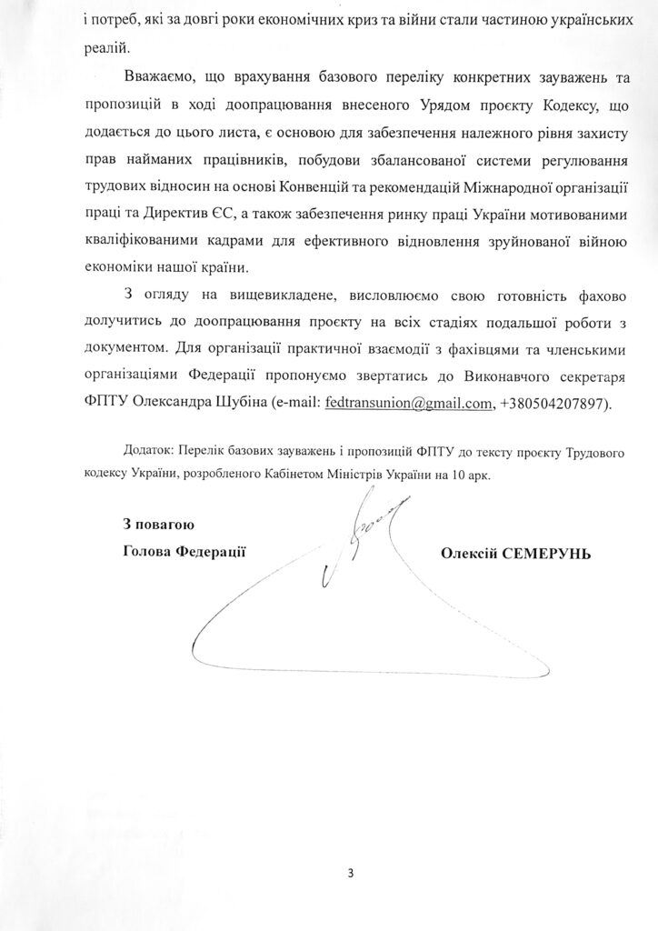 У зверненні Федерація надала свої базові пропозиції і наголосила на готовності фахово та системно долучитися до доопрацювання проєкту нового Трудового кодексу України на всіх стадіях подальшої роботи з документом.